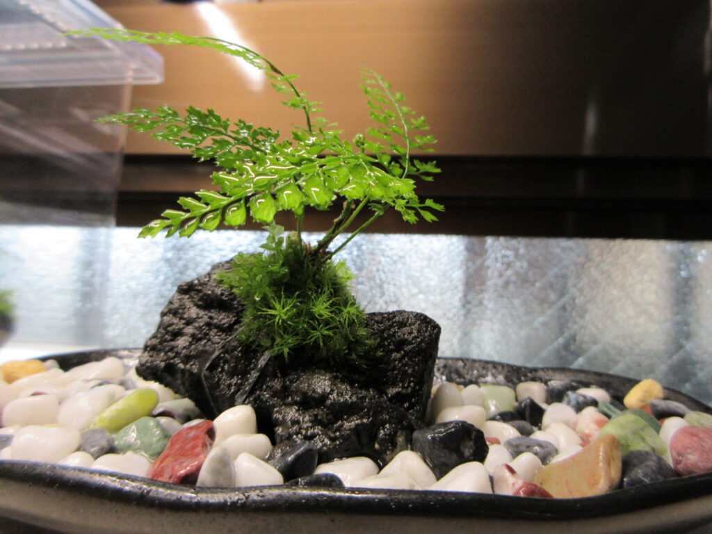 溶岩石に苔を植えて、2ヶ月かけて根付かせる。